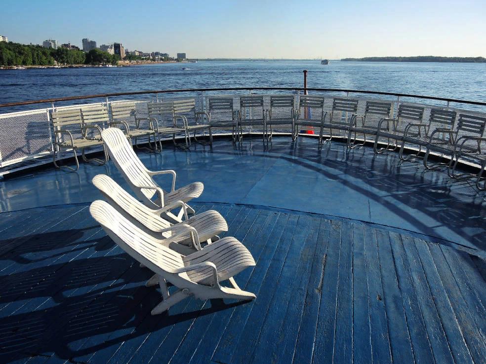 Открытая площадка на шлюпочной палубе оборудована для приема солнечных ванн. А еще отсюда открываются прекрасные виды на реки, берега и остающиеся за бортом суетливые города.