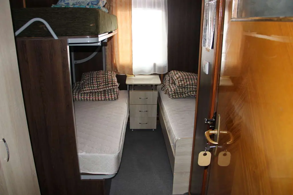 Трехместная двухъярусная каюта со всеми удобствами: три односпальных кровати (третье место расположено вторым ярусом), душ, туалет, радио, стол, стул, шкаф для одежды, обзорное окно.