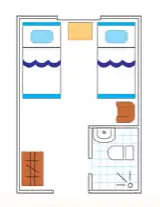 Двухместная одноярусная каюта со всеми удобствами: два односпальных места, розетка 220 V, радио, стул, шкаф для одежды, душ, туалет, раковина, обзорное окно.