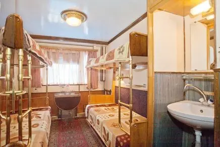 Четырехместная двухъярусная каюта с частичными удобствами: четыре односпальных места расположенные одно над другим, розетка 220 V, радио, стол, стул, шкаф для одежды, раковина (с горячей и холодной водой), обзорное окно.