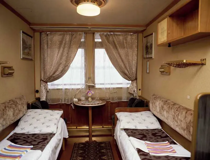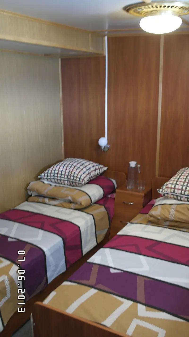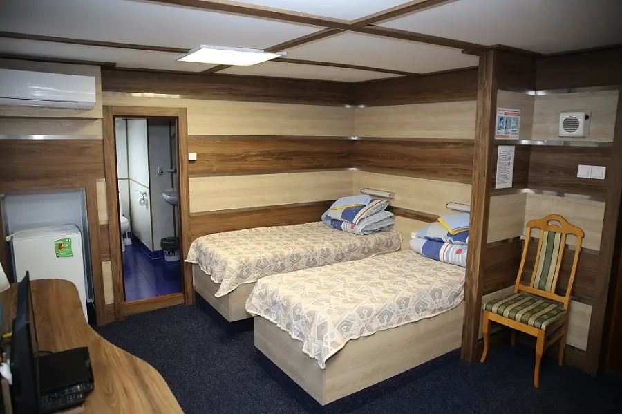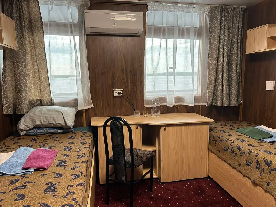 Однокомнатная двухместная каюта со всеми удобствами: двуспальная кровать или 2 односпальных кровати, душ, туалет, розетка 220 V, радио, холодильник, кондиционер, стол, стул, шкаф для одежды, два обзорных окна.