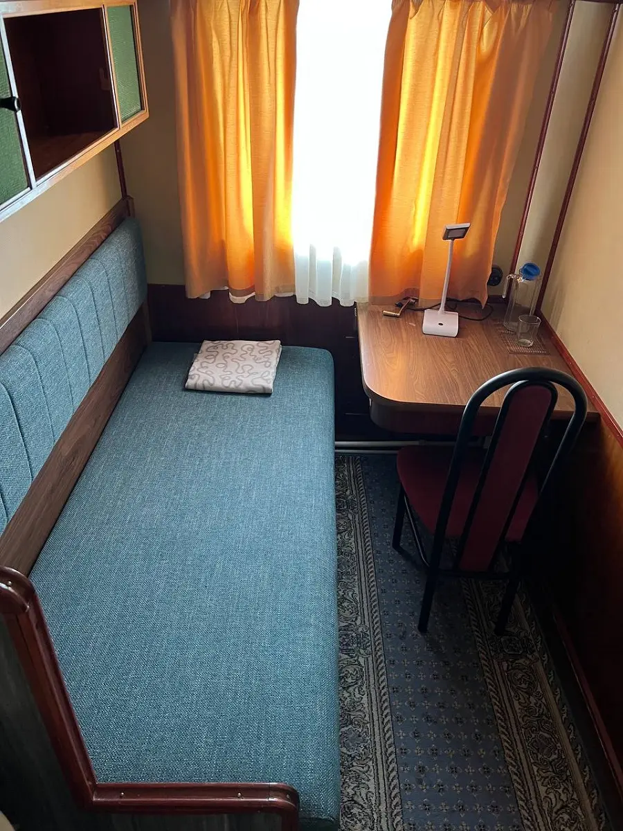 Одноместная каюта с частичными удобствами: односпальное место, шкаф для одежды, радио, стол, раковина (с горячей и холодной водой), обзорное окно.
