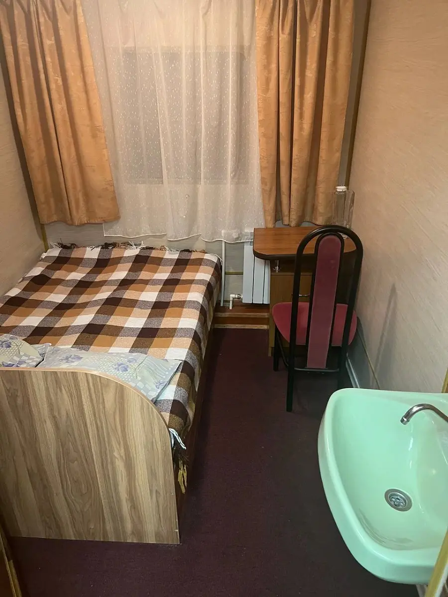 Одноместная каюта с частичными удобствами: одноместная кровать, электро розетка, радиоприемник, стол, шкаф для одежды, раковина (с горячей и холодной водой), обзорное окно.