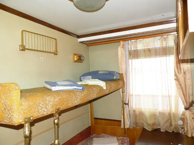 Двухместная двухъярусная каюта с частичными удобствами: два односпальных места (места расположены одно над другим), электро розетка, радио, стол, шкаф для одежды, раковина (с горячей и холодной водой), обзорное окно.