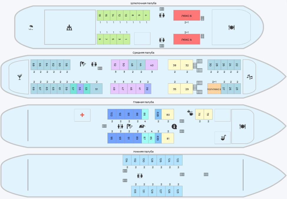 Двухместные каюты со всеми удобствами, расположенные в носовой и кормовой части теплохода. Здесь есть: две односпальные кровати, душ, туалет, розетка 220 V, радио, стол, стул, шкаф для одежды, обзорное окно.