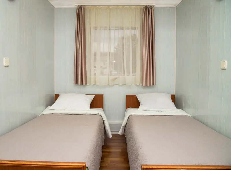 Каюты категории 1Б располагаются на средней и главной палубе, в кормовой части судна, двухместные, с частичными удобствами.