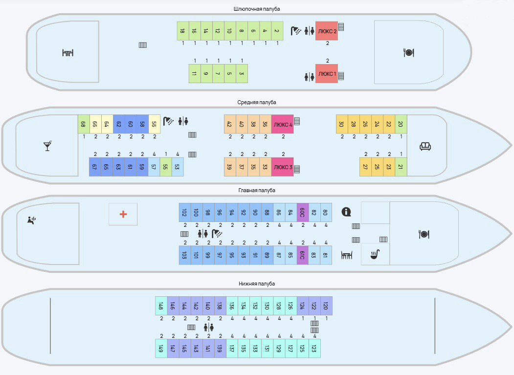 Каюты категории 1 располагаются на шлюпочной и средней палубе, с частичными удобствами. Цена: от 6557 руб./ночь с человека.