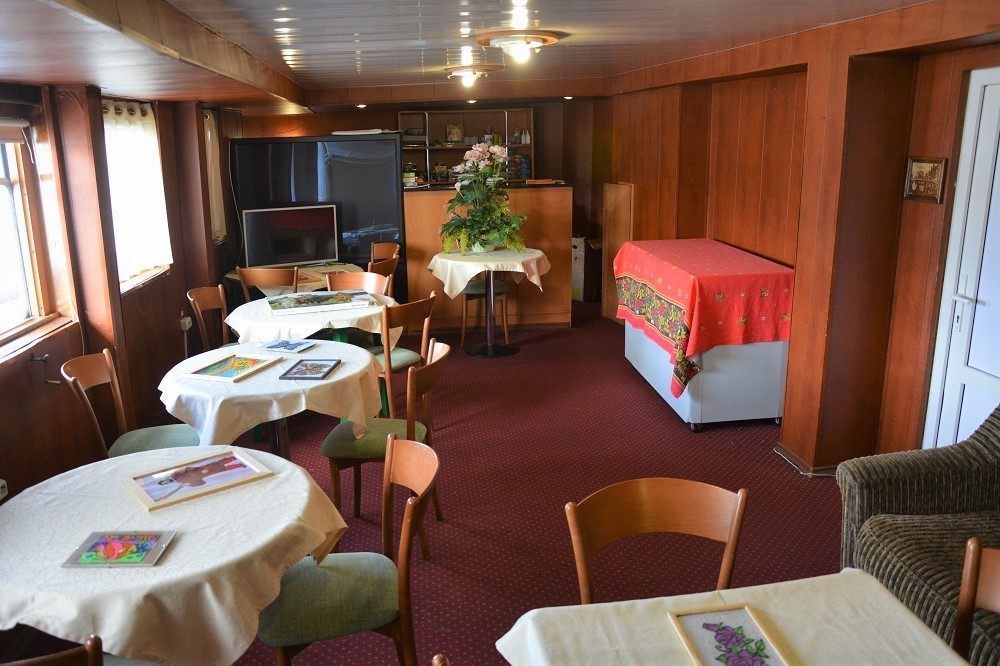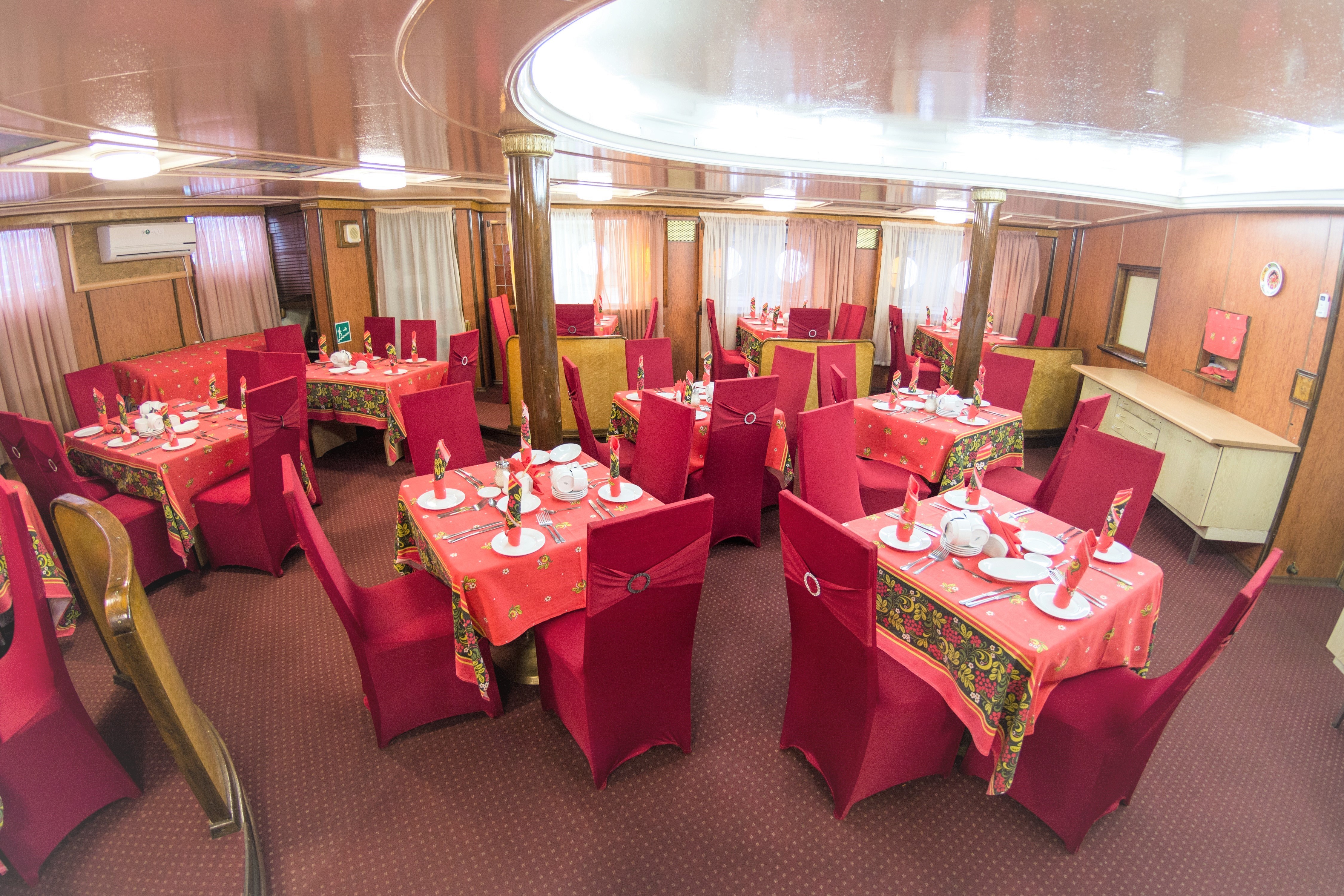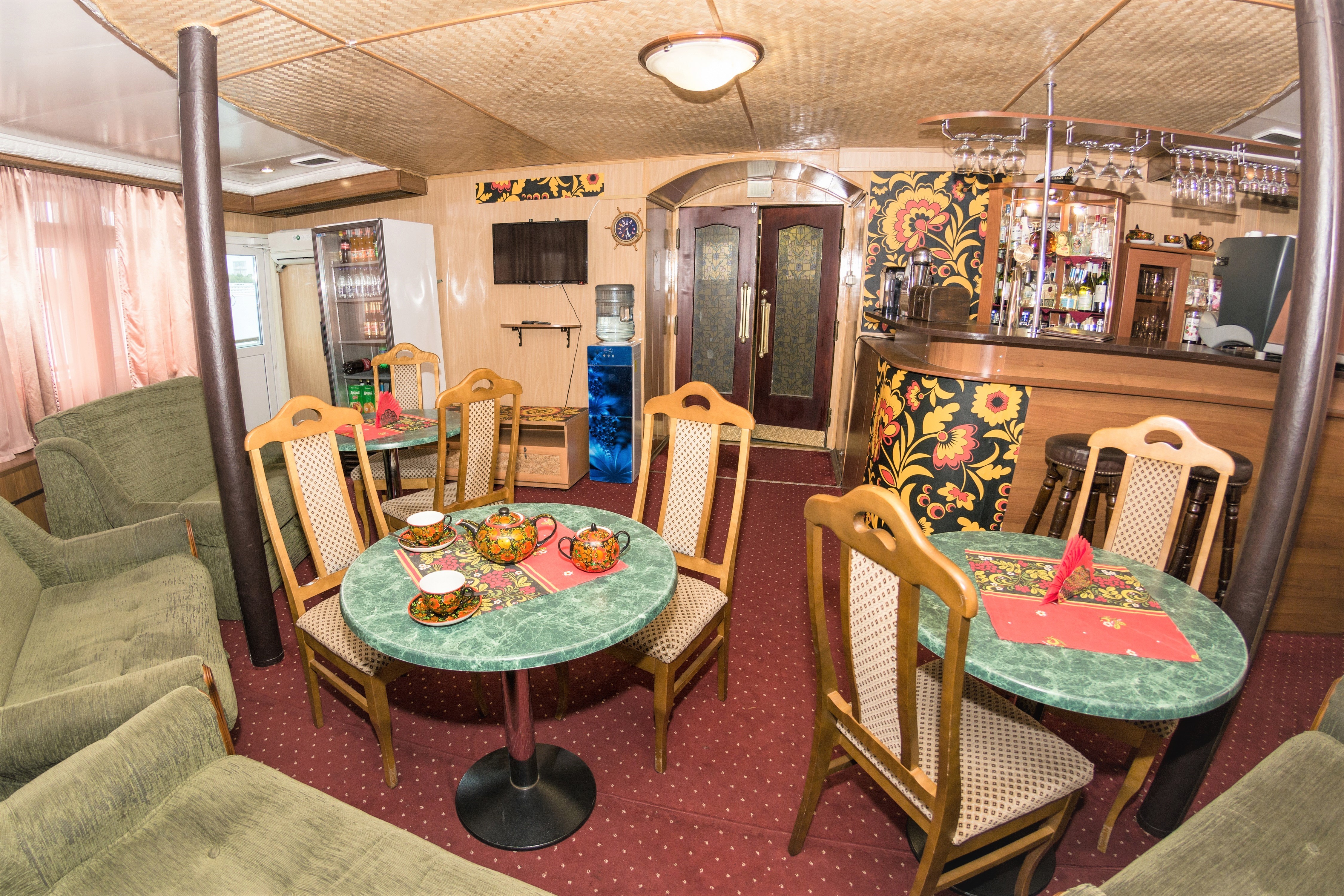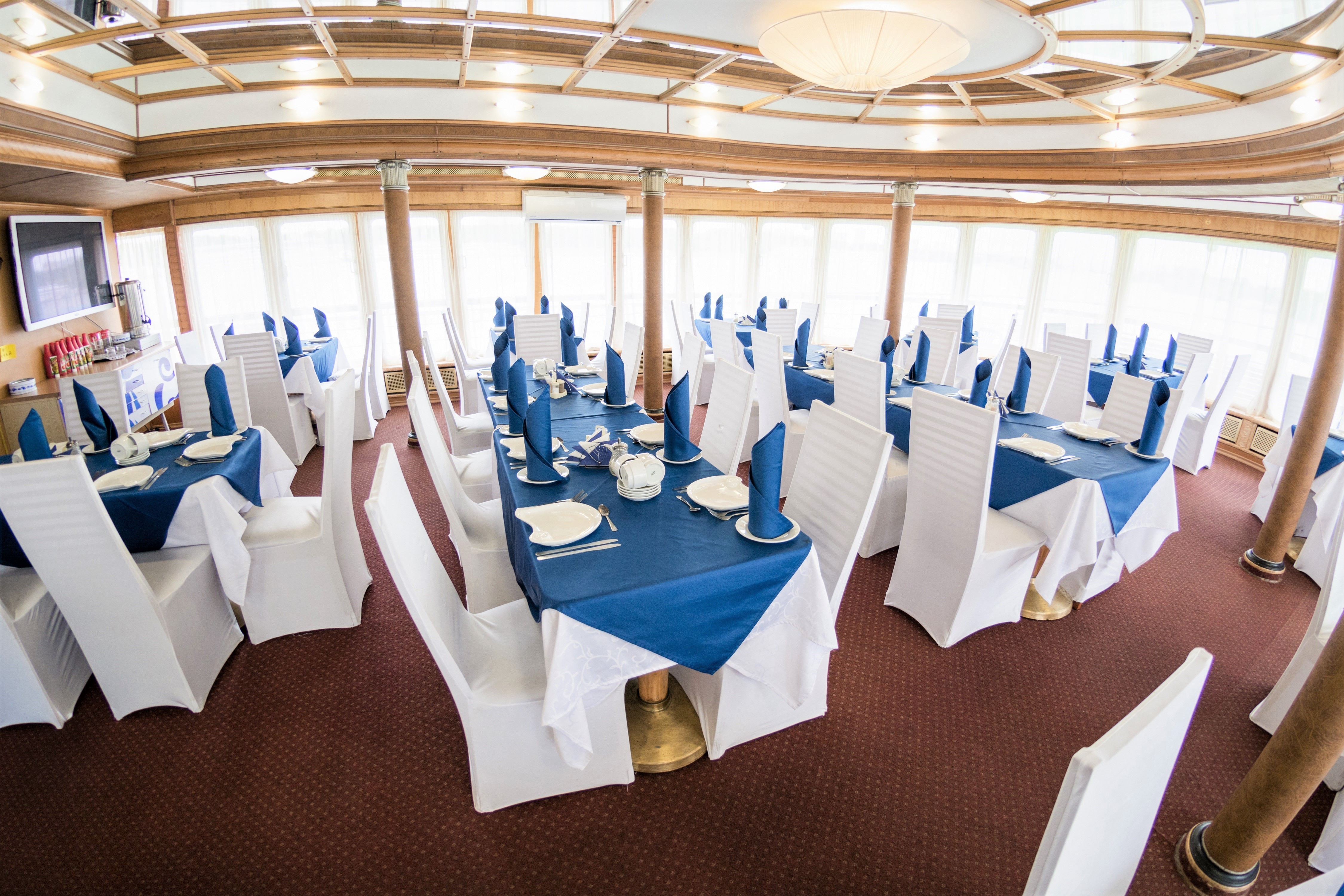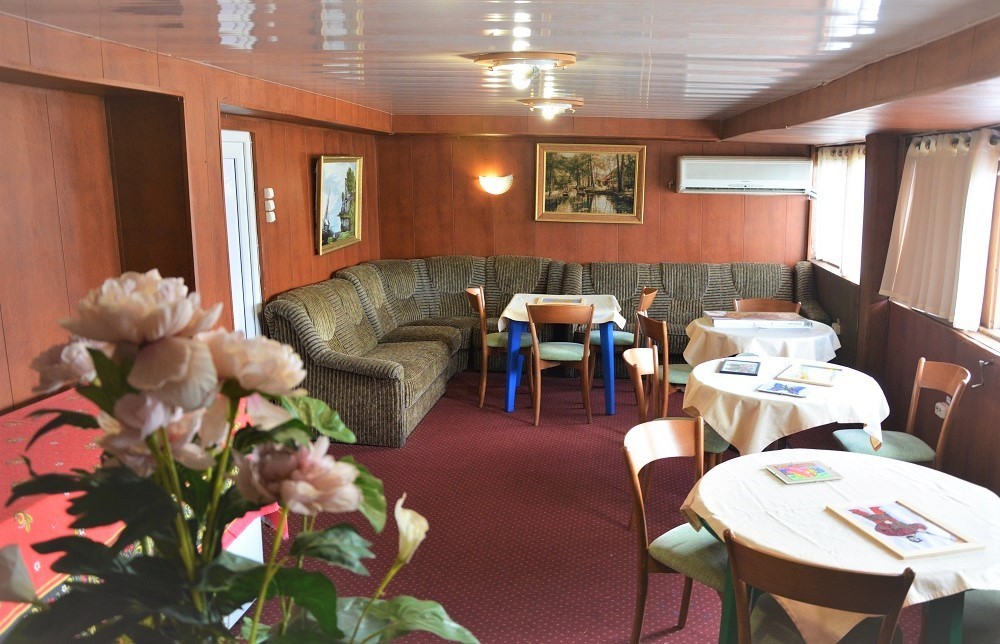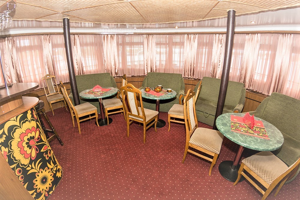 Питание на борту теплохода организовано в двух элегантных ресторанных салонах, расположенных на главной и шлюпочной палубах. Гостям предлагается заказное меню с разнообразными блюдами на завтрак, обед и ужин. В уютном баре можно провести время за бокалом напитка — в ассортименте широкий выбор как алкогольных, так и безалкогольных позиций.