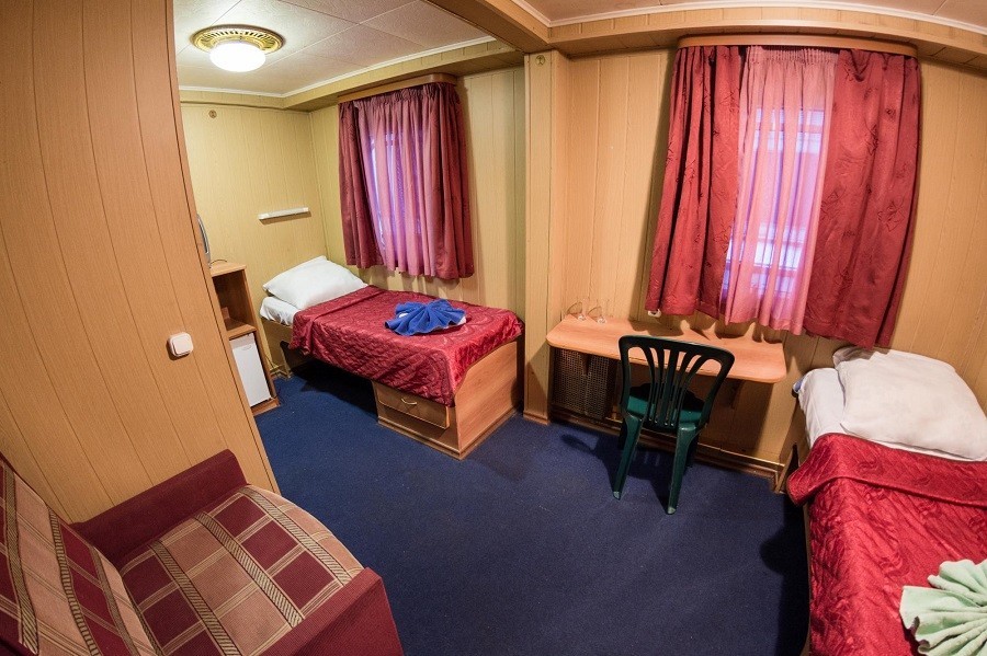 К категории Люкс относятся каюты: 401, 402. Двухместная каюта увеличенной площади со всеми удобствами, расположенная на шлюпочной палубе. Возможно размещение третьего человека на дополнительном спальном месте – раскладное кресло.