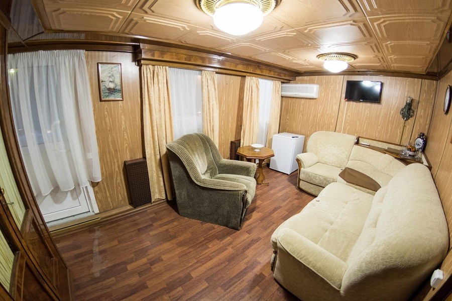 К категории Президентский люкс «Илья Муромец» относится каюта: 301. Двухкомнатная двухместная каюта со всеми удобствами, расположенная на средней палубе. Возможно размещение третьего человека на дополнительном месте – раскладной диван.